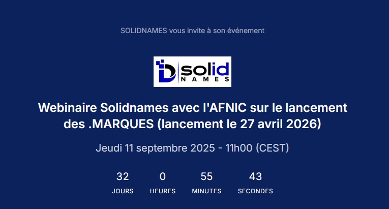 Le webinaire sur les extensions en .MARQUES organisé par Solidnames et l’AFNIC aura lieu le jeudi 11 septembre 2025 à 11h en distanciel.