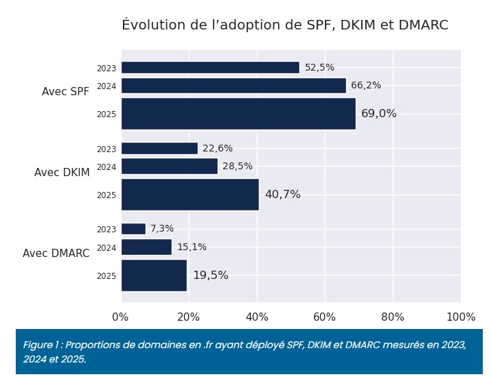 L’Afnic a étudié l’adoption de SPF, DMARC, DKIM et BIMI sur les noms de domaine en .FR. Par rapport à 2023, le déploiement de DMARC a doublé sur la zone .FR.